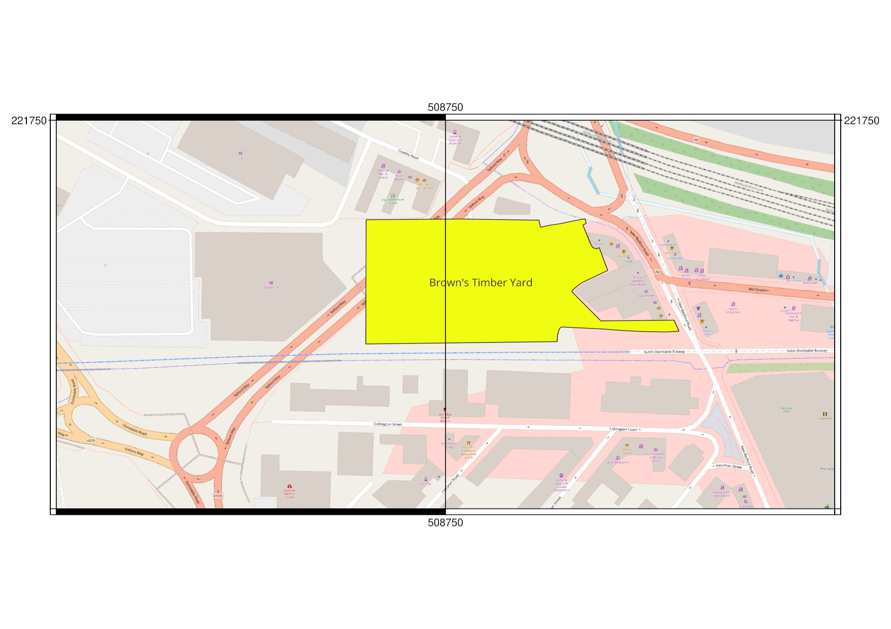 The area in central Luton that Brown’s Timber Yard was once situated. The timber yard boundary was created from the Ordnance Survey 1924 Luton map. Click here for a larger version.